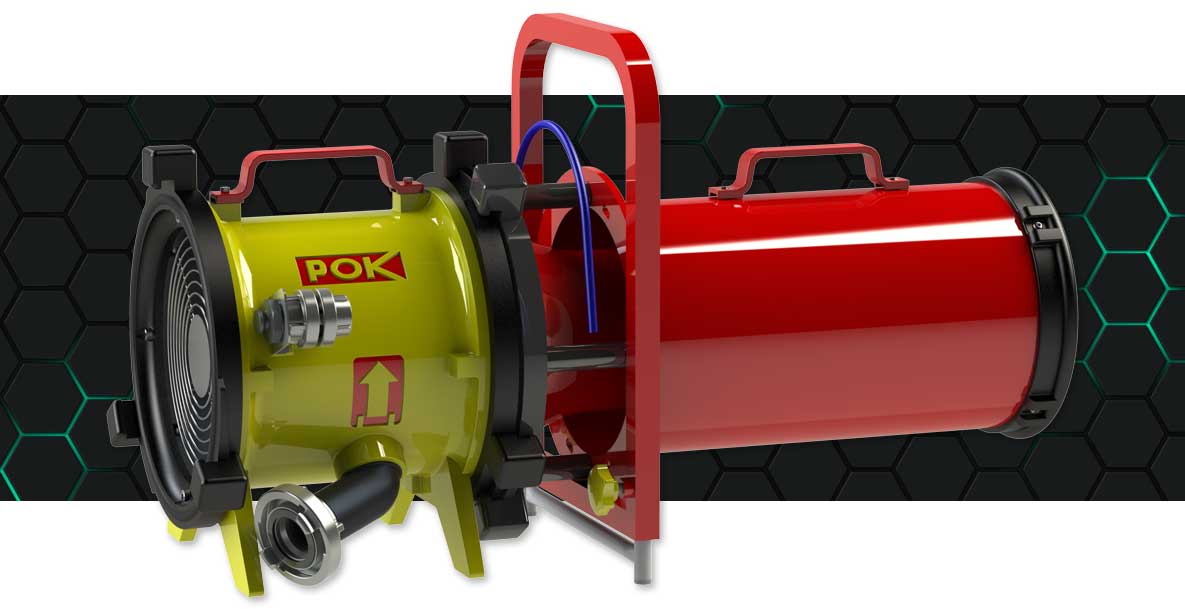 Mounted in a foam generator version, the diffuser is replaced by a self-suction nozzle equipped with the same Storz DN25 connection for ultra-fast assembly with an emulsifier suction hose passing through the foam tube whose function consists in rigorously mixing the air of the fan with the premixing performed by the base. You will notice that in this configuration, it is necessary to transport the foamer can near the foam generator. At 7 bars, the foam jet range is about 10 meters with an expansion of about 200 depending on the quality of the foamer.